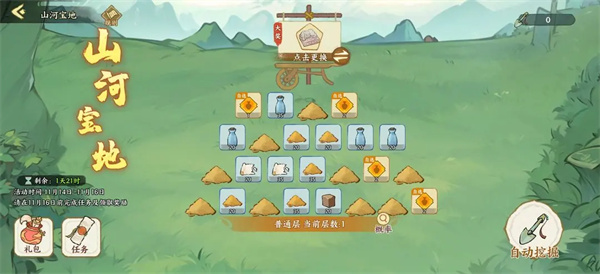 在华夏绘世录游戏中,山河宝地开服第5日首次开启,此后21天一次,许多玩家不知道怎么玩,下面就为大家带来华夏绘世录游戏中山河宝地活动的玩法攻略分享,有需要的玩家可以参考。 华夏绘世录山河宝地活动玩法 活动中共可白嫖33抽,元宝购买可再得45抽(100元宝1抽),因此,应当攒着铲子,至少攒2~3次,这样可以挖到特殊层。 注意提前更改自己想要的普通层和特殊层大奖,挖到大奖可以提前进入下一层,每5层1次特殊层,特殊奖励大奖可选天品文物碎片。 0氪不攒基本不可能挖到特殊层,低氪每天氪金再加上运气好才可能到特殊层。 每天任务全勤送十个,任意氪金可再多领十个。 |