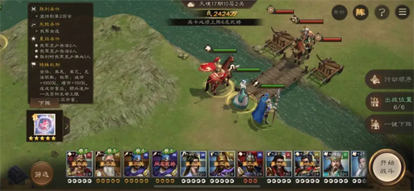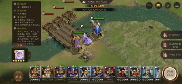 在新三国志曹操传中玩家需要完成许多不同的关卡和挑战,其中部分玩家不知道第十七期南华幻境10-2应该怎么过,下面就为大家带来新三国志曹操传中第十七期南华幻境10-2的攻略分享,有需要的玩家可以参考。 新三国志曹操传17期南华幻境10-2应该怎么过 星级条件: 1、我军至少存活2人 2、我军至少存活3人 3、胜利时我军至少满血1人 特殊机制: 全体:禁足,禁咒,无法驱散;敌军:减伤+1000%,增伤+100%,造成伤害后,额外追加一次目标生命上限的真实伤害。 站位: 左边:袁绍,甄姬,曹洪 右边:孙策,华佗,李典 其实就是按关卡推荐的武将上场,神兽上九尾狐。 按照上图站位,直接点结束回合。 下一回合直接三星通关。 |